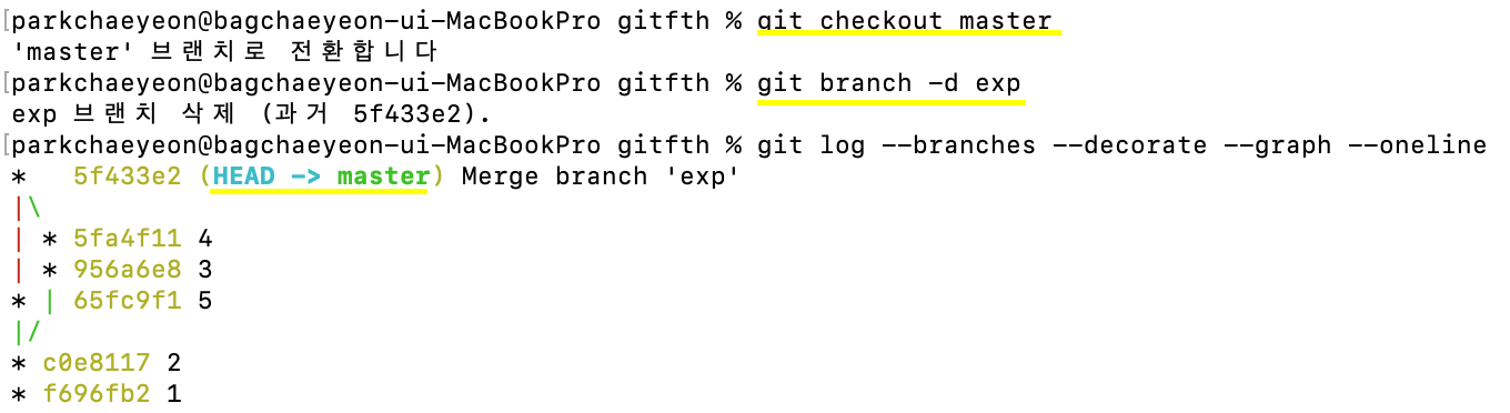 git branch -d exp : exp 브랜치가 삭제가 된다.