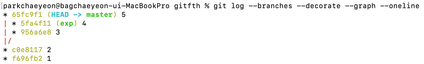 하지만 exp는 3,4번의 커밋을 갖고있지만 5번 커밋은 갖고있지 않다. exp도 마스터가 작업했던 5번 커밋을 포함하도록 만들어 보겠다.( 그럼 exp와 마스터는 완전히 같은 상태가 됨)