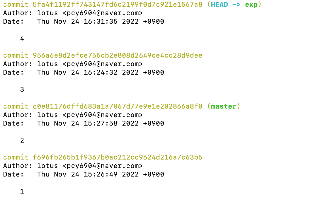 git log master..exp // 현재 내가 있는 마스터와 exp 사이에 차이가 무엇이냐 라는 명령
