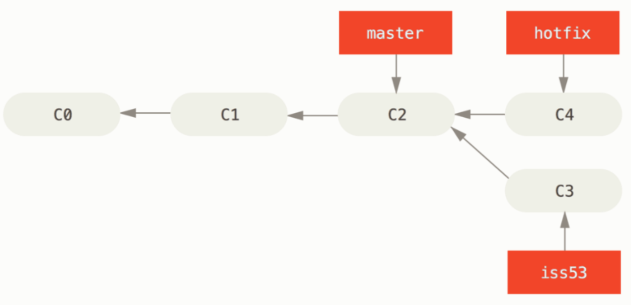 이제 마스터는 hotfix와 같은 커밋을 가르키게 된다. 그렇기 때문에 별도의 커밋을 생성하지 않는다.