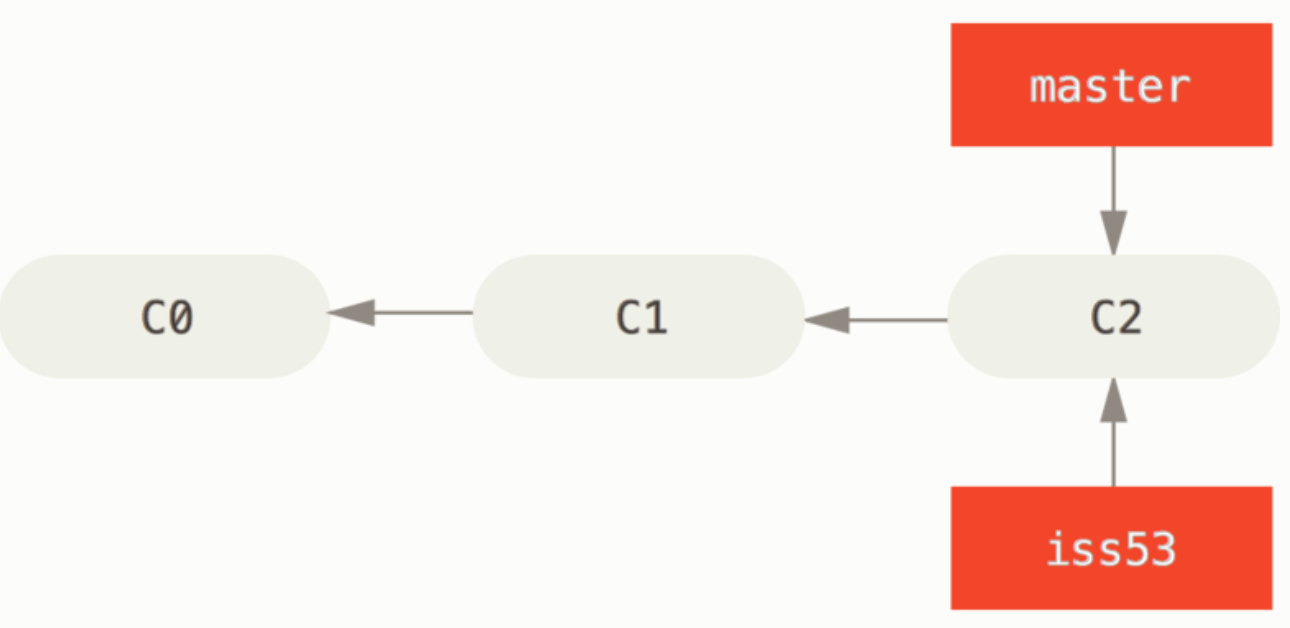 c2커밋을 마스터와 iss53이 동시에 가리키게 된다.