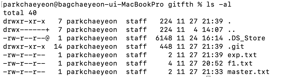exp 브랜치에서 common.txt 파일을 만들고 마스터 브랜치로 체크아웃하여 merge를 해주고 ls -al을 해보면 master브랜치에도 common.txt가 자동으로 만들어져 있는 걸 확인할 수 있다.