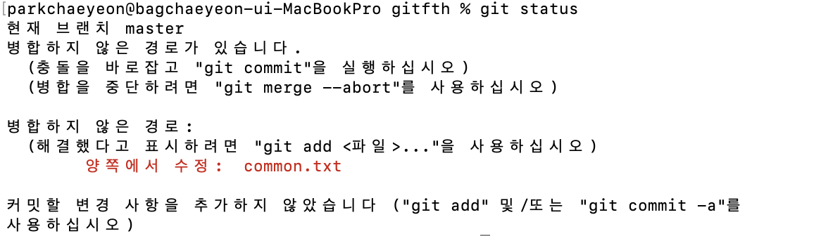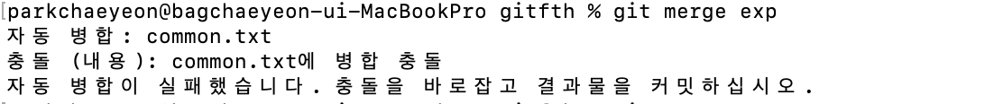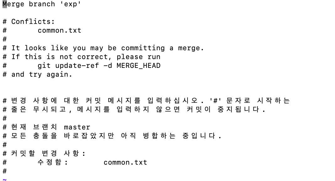 정리해보자면 지금 현재 상황은 master와 exp가 common.txt라는 파일에 서로 다른 부분을 수정하였다.
