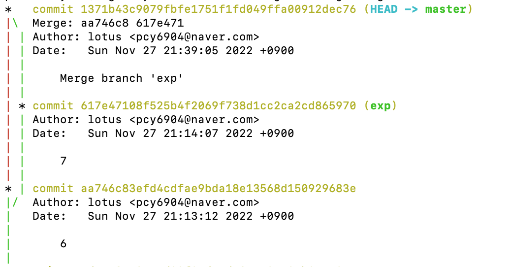 exp의 커밋과 마스터가 원래 가지고 있었던 커밋6이 병합된 새로운 커밋에 마스터가 체크아웃 되어 있는 상태이다.