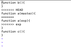 참고로 exp브랜치에서 처음 common.txt의 내용의 functin a(){} 였고 마스터 브랜치에서는 기존 내용위에 function b(){}을 입력하였고 다시 exp브랜치로 넘어와서는 기존내용 밑에 function c(){}을 입력하였다.