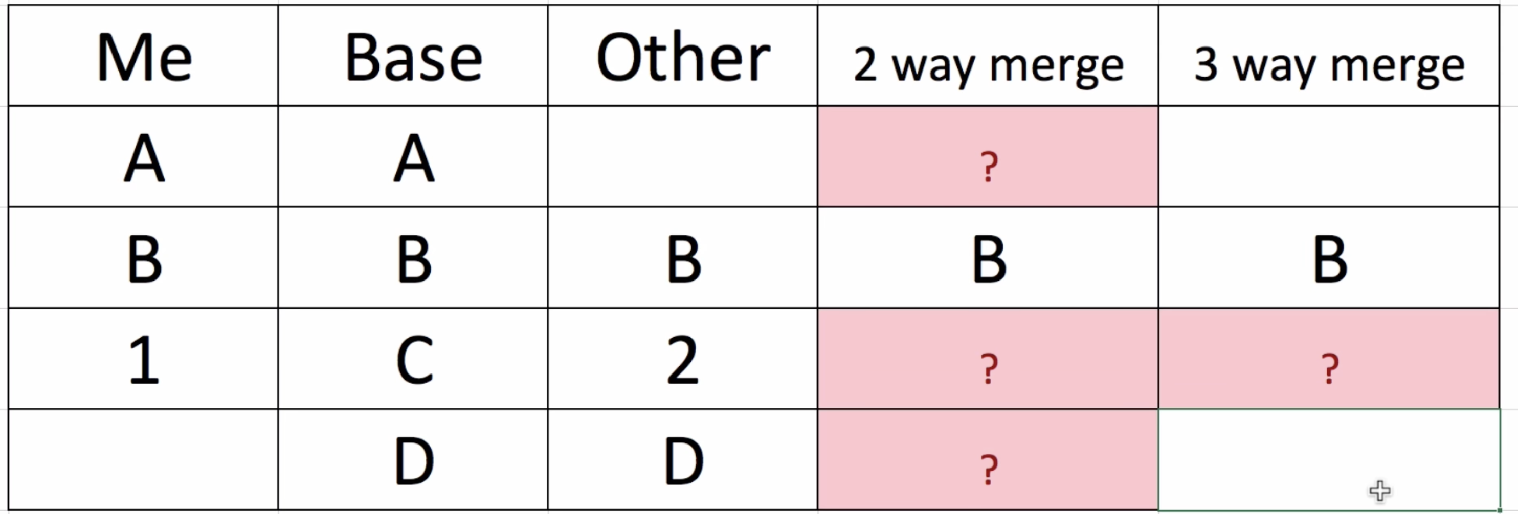 2way merge에서는 Base를 참고하지 않기 때문에 오로지 두개의 브랜치만 보고 결정을 해야하는데 내용이 같은 B부분 말고는 어느것이 수정이 되었고 맞는지 확인할 수 없기 때문에 conflict라는 결론을 낸다.